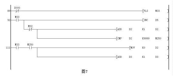 ② 為了滿足成品產量的計數功能,我們設計了一段程序,最大容量可以計數1億包。按每分鐘120包的產量計算,每天兩班16小時,每月30天,可以累計2年的產量。這充分利用了PLC數據寄存器的功能。(程序見圖7)