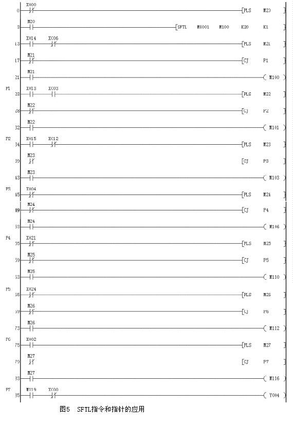 煙包在機器上有20個工位完成一系列封裝工序,其中7種不合格煙包的故障監測傳感器分別分布在第1,2,4,7,11,13,17工位上。我們指定M100到M119內存區作為移位寄存器,利用同步脈沖作移位觸發信號,就實現了生產中發生的任何1種或2種以上不合格品同時出現時,均可在同一個指定工位排序將它們剔除。(程序實例請見圖5,6)