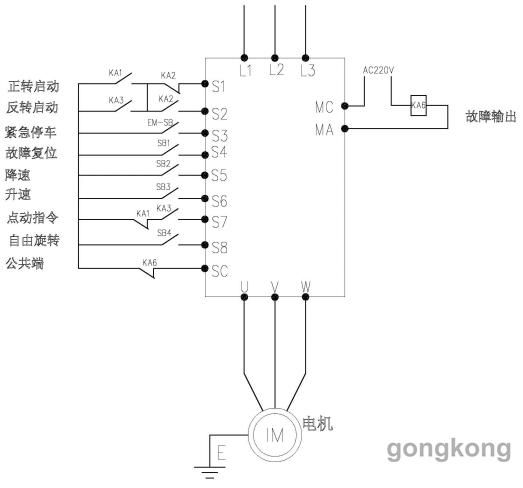 功能端子SC/S8可實(shí)現(xiàn)自由停車,SC/S4可實(shí)現(xiàn)報(bào)警復(fù)位,SC/S3可實(shí)現(xiàn)緊急停止,可根據(jù)需要選用。