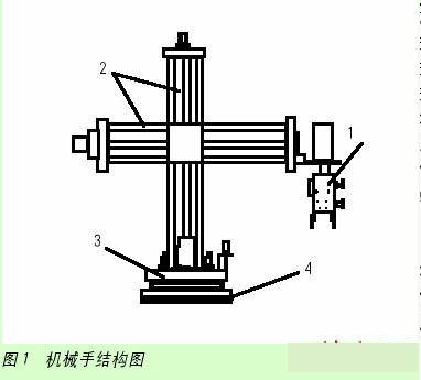 機(jī)械手結(jié)構(gòu)如下圖1所示,有氣控機(jī)械手(1)、XY軸絲杠組(2)、轉(zhuǎn)盤(pán)機(jī)構(gòu)(3)、旋轉(zhuǎn)基座(4)等組成。