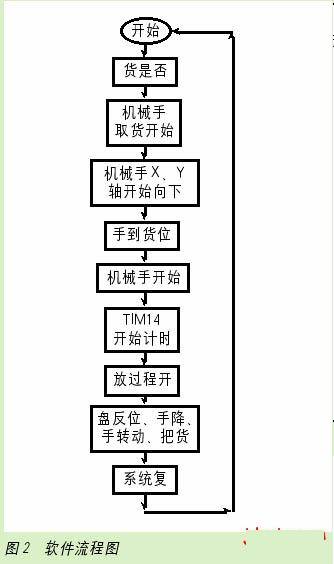 步進(jìn)電機(jī)驅(qū)動(dòng)縱軸上升,另一個(gè)步進(jìn)電機(jī)驅(qū)動(dòng)橫軸開(kāi)始向前走;轉(zhuǎn)盤(pán)直流電機(jī)轉(zhuǎn)動(dòng)使機(jī)械手整體運(yùn)動(dòng),轉(zhuǎn)到貨物接收處;步進(jìn)電機(jī)再次驅(qū)動(dòng)縱軸下降,到達(dá)指定位置后,氣閥放氣,機(jī)械手松開(kāi)貨物;系統(tǒng)回位準(zhǔn)備下一次動(dòng)作。