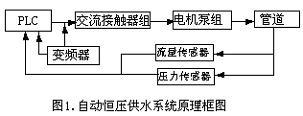 典型的自動恒壓供水系統(tǒng)的結(jié)構(gòu)框圖如圖1所示;系統(tǒng)具有控制水泵出口總管壓力恒定、變流量供水功能,系統(tǒng)通過安裝在出水總管上的壓力傳感器、流量傳感器,實時將壓力、流量非電量信號轉(zhuǎn)換為電信號,輸入至可編程控制器(PLC)的輸入模塊,信號經(jīng)CPU運(yùn)算處理后與設(shè)定的信號進(jìn)行比較運(yùn)算,得出最佳的運(yùn)行工況參數(shù),由系統(tǒng)的輸出模塊輸出邏輯控制指令和變頻器的頻率設(shè)定值,控制泵站投運(yùn)水泵的臺數(shù)及變量泵的運(yùn)行工況,并實現(xiàn)對每臺水泵根據(jù)CPU指令實施軟啟動、軟切換及變頻運(yùn)行。系統(tǒng)可根據(jù)用戶用水量的變化,自動確定泵組的水泵的循環(huán)運(yùn)行,以提高系統(tǒng)的穩(wěn)定性及供水的質(zhì)量。