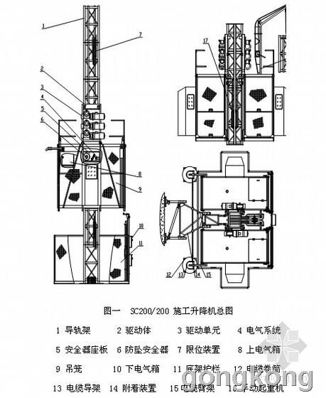 1、施工升降機(jī)的組成:施工升降機(jī)主要組成部分如下:導(dǎo)軌架、吊籠、傳動(dòng)系統(tǒng)、附墻架、底架護(hù)欄、電氣系統(tǒng)、安全保護(hù)裝置、電纜供電裝置等。如圖所示: