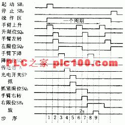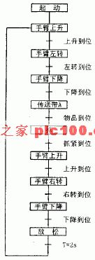 根據(jù)對機(jī)械手的順序動(dòng)作要求,可以畫出時(shí)序圖如圖2所示。由時(shí)序圖可作出圖3所示的機(jī)械手動(dòng)作流程圖。