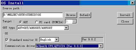 1. 安裝A9GT-RS4或A9GT-RS2通訊板,安裝對應(yīng)的通訊驅(qū)動(A/QnA/Q CPU,QJ71C24)A900GOT