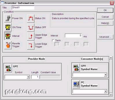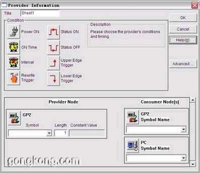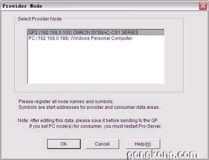 下圖表示每隔10000ms就將GP2節點上地址D03400的BCDWORD傳給PC節點,在PC節點上執行ACTION1。