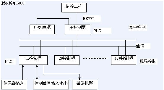該攔河壩由17孔啟閉式閘門組成閘門 其跨度約為300m,閘門的最大開度可達1.7m。閘門控制房距離大壩迎水面40m。由于地理跨度較大,本閘門控制系統采用總線分布式分級控制方式進行設計。