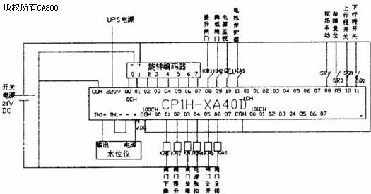 輸出通道100CH的輸出為閘門的控制信號以及提示、報警信息。圖中的IN1+、IN1一為模擬量輸入通道。它與水位儀連接。由于CP1H系列PLC提供了一個24VDC的電源輸出,所以可以直接作為水位儀的電源。