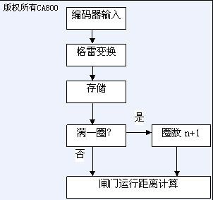 閘位的采集通過8位增量式旋轉編碼器輸入得到。其輸入通道為CIO0.00~CIO0.07。由于編碼器輸入的是格雷碼,所以需要采用格雷碼轉換指令(GRY)將其轉化為BIN(-進制化16進制)數據(存儲與D20)。由于編碼器的位數僅8位,因此還要對編碼器所轉過的圈數(D70)進行軟件的采集計算。最后根據編碼器的圈數D70和此時編碼器的值D20計算閘門的運行距離(D250)。其計算公式為:D250=D70*單圈高度+D20。其流程圖如圖4。