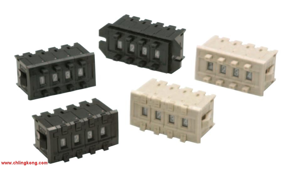 可開關從微小負載 (小適用負載DC5V 1mA)到大容量負載歐姆龍撥碼開關。形狀:長方形。