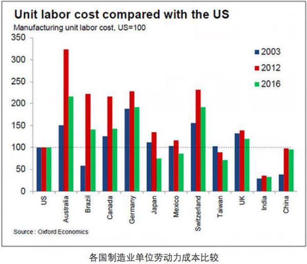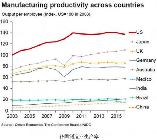 牛津經濟研究院2016年初發布的報告顯示,如果美國的勞動力成本指數是100,中國則達到96。這是因為,雖然薪資方面美國遠高于中國,美國工人的產出也遠高于中國工人。報告顯示,美國員工的單人產出指數在2016年達到140,相比之下,中國員工的單人產出指數甚至達不到20。