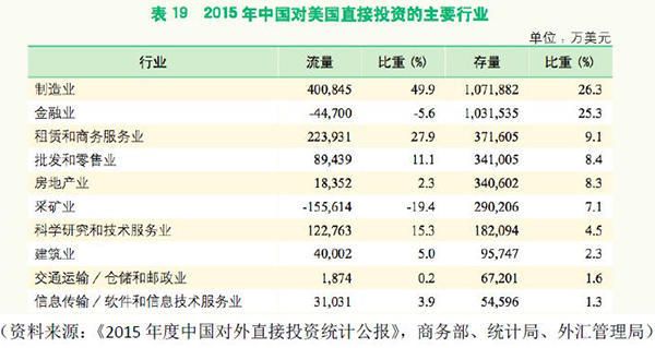 商務部發布的公報顯示,2015年,在中國對美國的直接投資中,制造業的投資份額已經占到了首位,達到40.08億美元,比2014年增長一倍有余。到2015年末,中國已累計有107.19億美元的資金投存在美國的制造業,超過了其他行業。制造業投資在主要分布在汽車制造業、黑色金屬冶煉和壓延加工業、醫藥制造業等領域。但楊華東比較下來,“德國,法國,英國,日本,甚至韓國,在美國的實業投資都多于中國”。