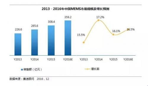 中國智能手機、平板電腦、可穿戴設備等MEMS應用整機產品產量保持穩定增長物聯網 帶動加速傳感器、陀螺儀、硅麥克風等產品需求的增長。與此同時MEMS市場,上述整機產品中MEMS市場,加速度傳感器、陀螺儀、硅麥克風等的滲透率進一步提高對MEMS市場規模的擴大也起到重要作用。另外MEMS市場,中國汽車工業的增長也推動了壓力傳感器、微機械陀螺儀等MEMS主力產品市場的增長。隨著國際消費市場的回升,以及市場基數的增大,中國MEMS市場增速將保持穩定。預計2016年,中國MEMS市場銷售額預計將達359.2億元。