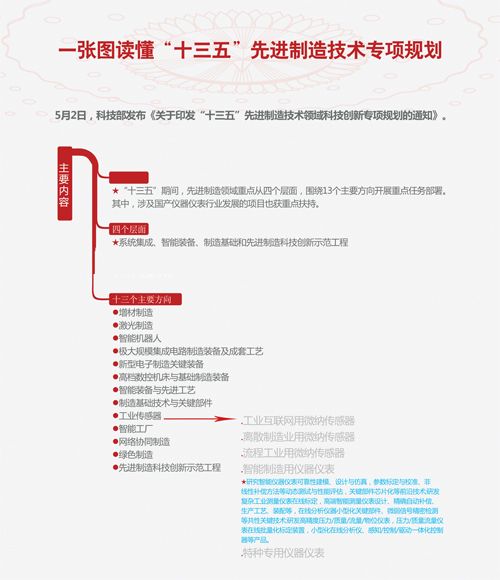 《專項規劃》指出規劃,按照總體目標、發展思路和戰略布局的要求規劃,“十三五”期間規劃,先進制造領域重點從“系統集成、智能裝備、制造基礎和先進制造科技創新示范工程”四個層面中國制造,圍繞13個主要方向開展重點任務部署中國制造,包括增材制造、激光制造、智能機器人、極大規模集成電路制造裝備及成套工藝、新型電子制造關鍵裝備、高檔數控機床與基礎制造裝備、智能裝備與先進工藝、制造基礎技術與關鍵部件、工業傳感器、智能工廠、網絡協同制造、綠色制造、先進制造科技創新示范工程等。