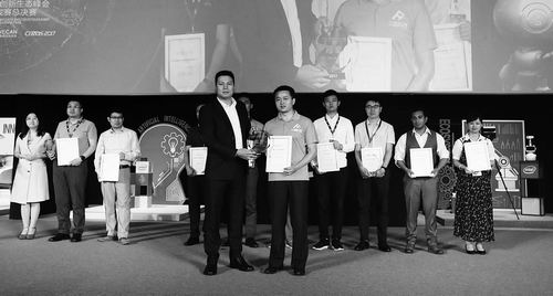 英特爾中國戰略合作部總經理李德勝(左)為機器人創新挑戰賽冠軍眾趣公司CEO高翔頒獎。