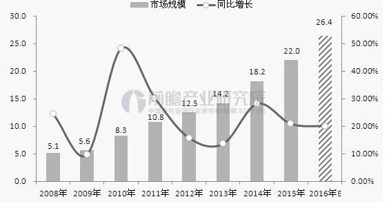 2008-2016年我國機(jī)器視覺行業(yè)市場(chǎng)規(guī)模及增長(zhǎng)率(單位:億元,%)