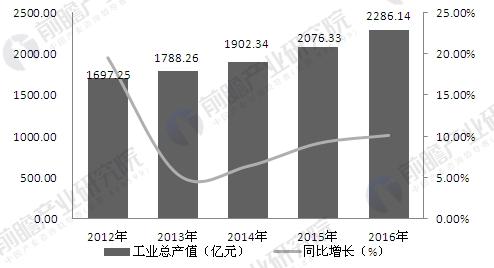 2012-2016年工業自動化行業總產值及同比增速(單位:億元智能制造,%)