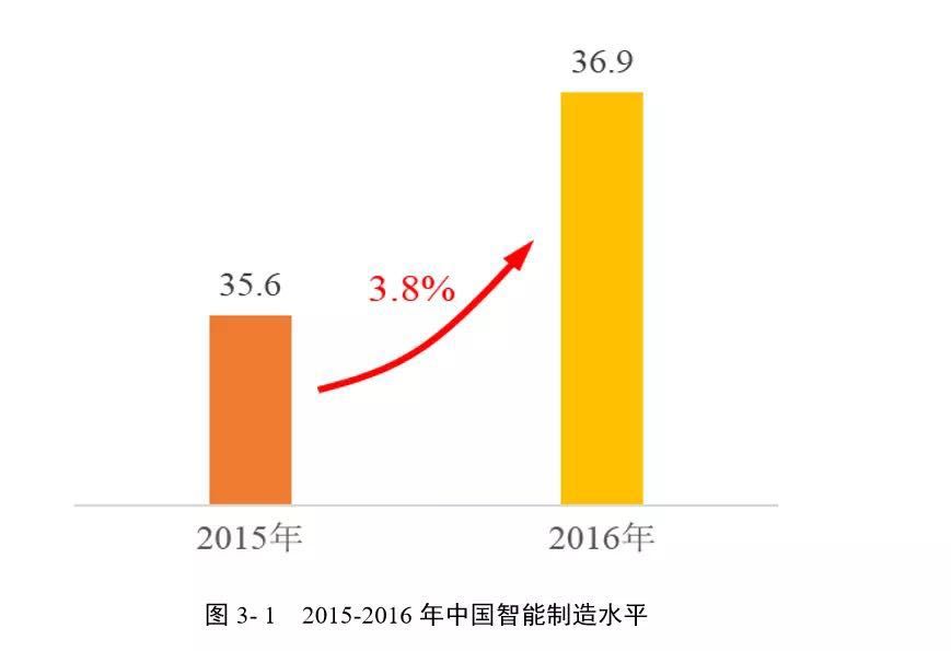 MCII指數基準為100,30的分值代表達到工業2.0水平,60代表達到工業3.0水平,90以上代表達到工業4.0水平。報告顯示,2016年中國制造信息化指數為36.9,較2015年的35.6提高了3.8%,中國制造業總體水平正由工業2.0向3.0過渡。