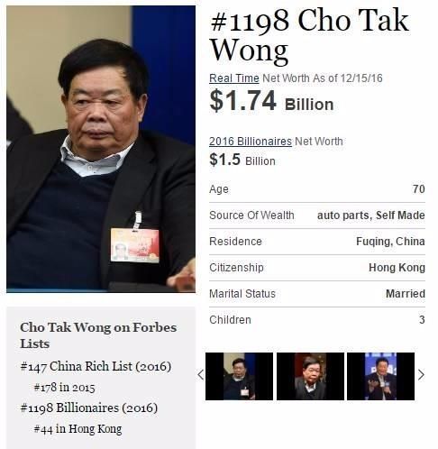 在2016年福布斯全球億萬富豪排行榜上,曹德旺以17.4億美元的身家位列第1198名。